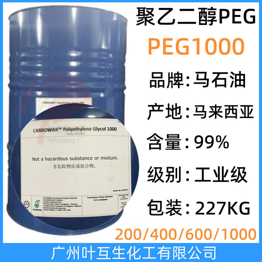 依分子量不同而性質不同,從無色無臭黏稠液體至蠟狀固體。分子量200~600者常溫下是液體,分子量在600以上者就逐漸變為半固體狀,隨著平均分子量的不同,性質也有差異。從無色無臭粘稠液體至蠟狀固體。隨著分子量的增大,其吸濕能力相應降低。本品溶于水、乙醇和許多其它有機溶劑。蒸氣壓低,對熱、酸、堿穩定。與許多化學品不起作用。有良好的吸濕性、潤滑性、粘結性。無毒,無刺激。平均分子量300,n=5~5.75,熔點-15~8℃,相對密度1.124~1.130。平均分子量600,n=12~13,熔點20 ~25℃,閃點246℃,相對密度1.13 (20℃)。平均分子量4000,n=70~85,熔點53~ 56℃。
